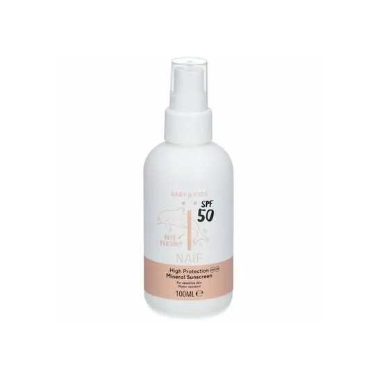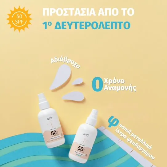 Το αντηλιακό σπρέι της Naif με SPF50 προσφέρει υψηλή προστασία ενάντια στις UVA/UVB ακτίνες.