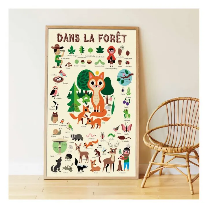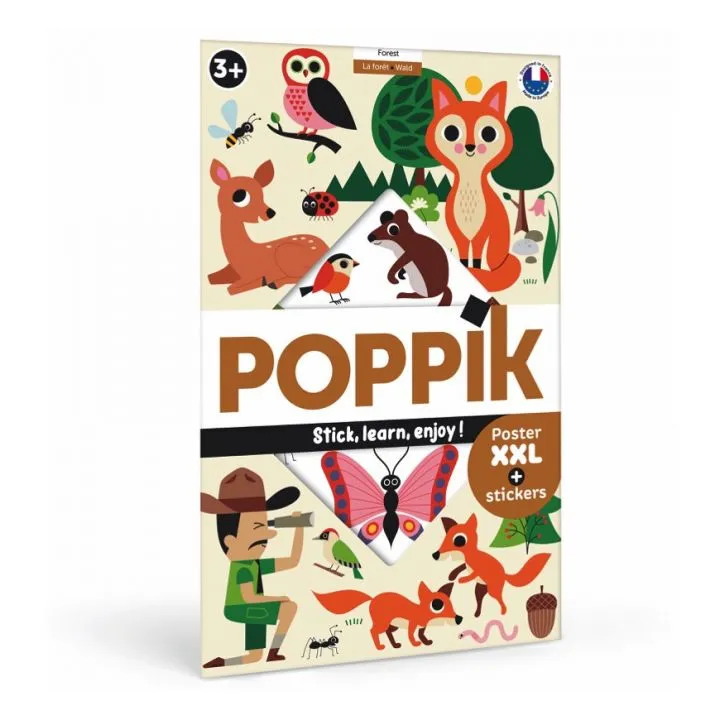 Μια πολύ ωραία αφίσα με στοιχεία δάσους η οποία συμπληρώνεται με 60 επανατοποθετούμενα αυτοκόλλητα από την Γαλλική εταιρεία Poppik. Το παιδί κολλάει στην αφίσα 60 μεγάλα αυτοκόλλητα, ακολουθώντας τους αριθμούς που του υποδεικνύονται και που αντιστοιχούν σε ζώα, φυτά αλλά και χαρακτήρες συνδεδεμένους με το δάσος. Ο σκαντζόχοιρος, το ελαφάκι, η αλεπού, αλλά και φύλλα δέντρων με τα διάφορα σχήματα που μπορεί να συγκρίνει μεταξύ τους το παιδί και τέλος διάσημοι χαρακτήρες όπως η κοκκινοσκουφίτσα, ο ξυλοκόπος και ο δασοφύλακας γίνονται τα αυτοκόλλητα αυτής της μαγευτικής αφίσας.