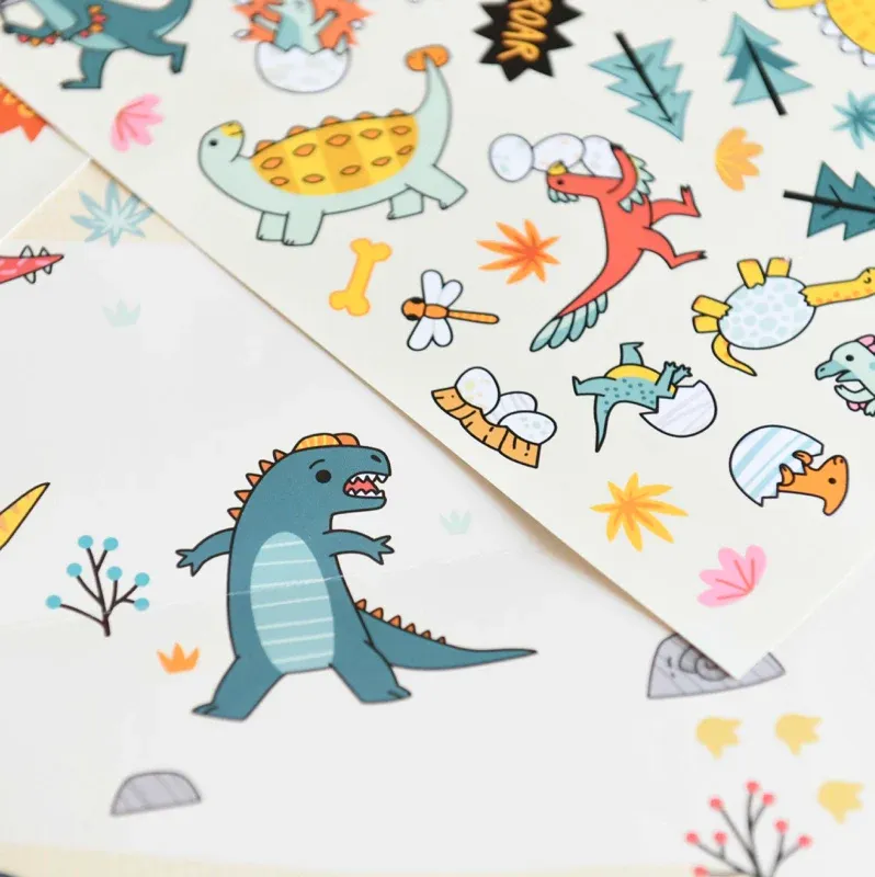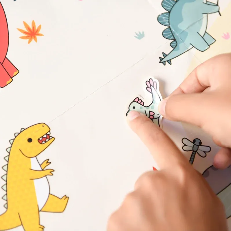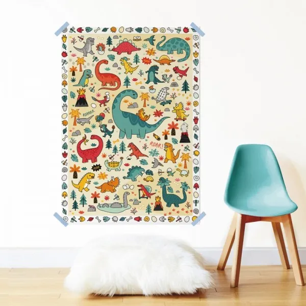 Το παιδί ξεδιπλώνει την αφίσα και κολλάει πάνω τους αστείους δεινόσαυρους, ενώ εφευρίσκει τις δικές του ιστορίες. Τα αυτοκόλλητα είναι ημι-επανατοποθετημένα, ώστε να μπορούν να αντικατασταθούν μία ή δύο φορές. Εάν είναι απαραίτητο, παρέχεται ένα παράδειγμα στο πακέτο. Μόλις ολοκληρωθεί, αυτή η υπέροχη αφίσα θα μπορεί να διακοσμήσει το δωμάτιο!