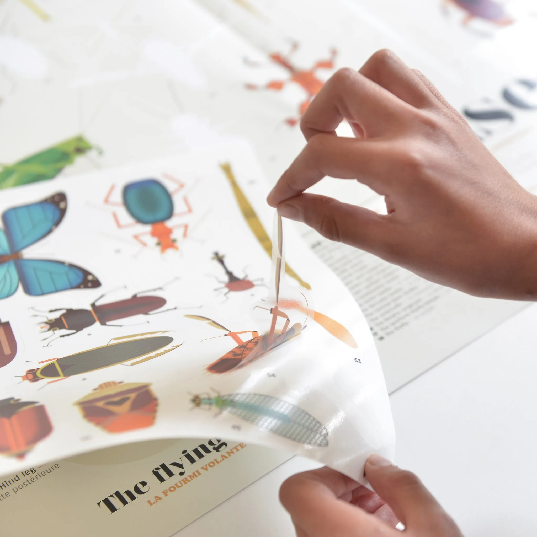 Ένα πολύ όμορφο πόστερ εντόμων με 44 μεγάλα αυτοκόλλητα, που το καθένα μπορεί να ξανακολληθεί. Κάθε έντομο έχει έναν αριθμό για να μπορεί το παιδί εύκολα να το κολλά στην αφίσα, ακολουθώντας τους αριθμούς που υποδεικνύονται. Αυτά τα αυτοκόλλητα αντιπροσωπεύουν όλα τα είδη εντόμων: σκαθάρια, δίπτερα, το καθένα πιο όμορφο από το άλλο.